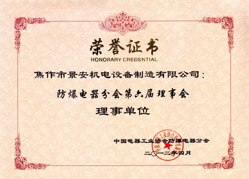 防爆電器分會理事單位證書