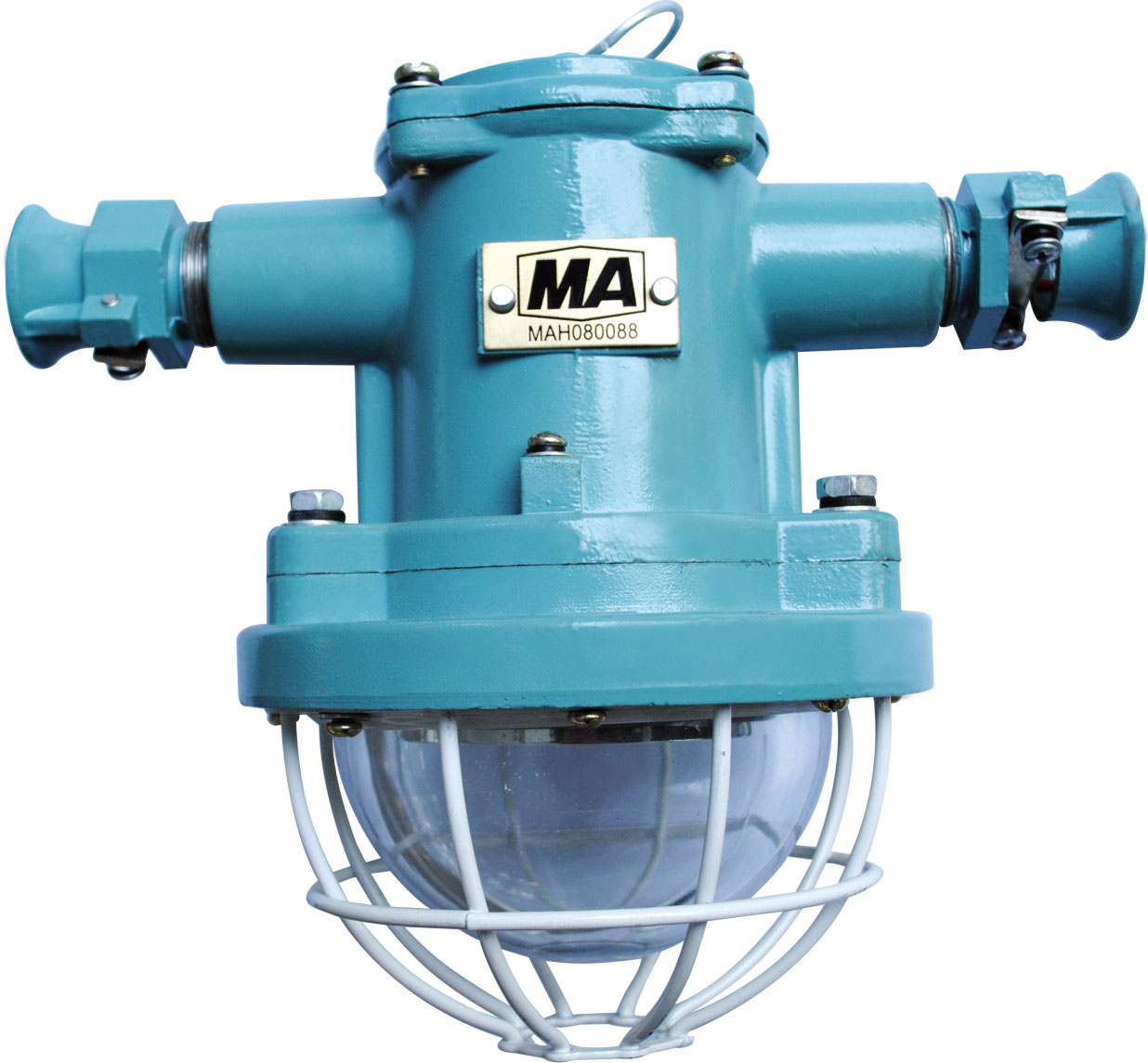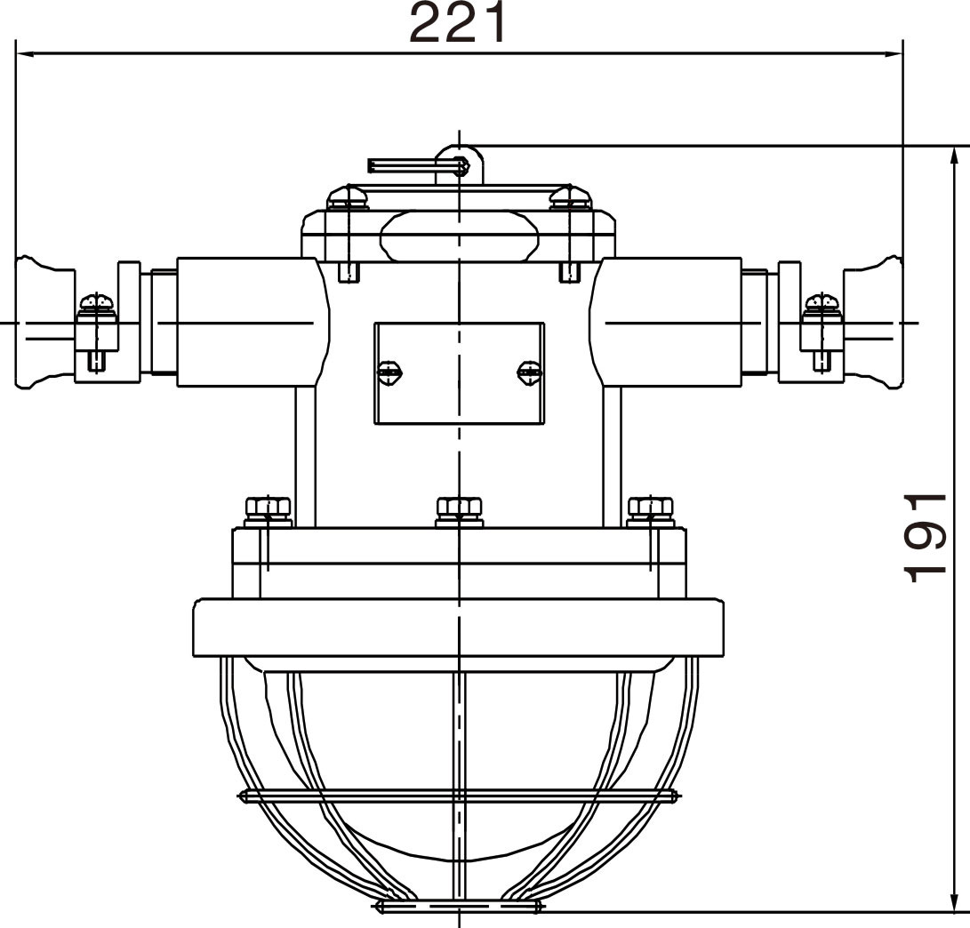 LED燈由上蓋、上殼體、下殼體、防爆透明玻璃罩、護(hù)罩等組成,上蓋與上殼體用M4螺釘連接,下殼體用M6螺釘與上殼體相連。防爆透明玻璃罩、護(hù)罩用M4螺釘固定在下殼體上。上殼體外有M4外接地螺釘、銘牌等。上殼體內(nèi)有接線板、M4內(nèi)接地螺釘、LED驅(qū)動(dòng)電源板。下殼體內(nèi)有密封墊、防爆透明玻璃罩、LED光源、散熱板。散熱板通過上殼體將光源熱量散發(fā)到燈體外。上蓋、上殼體、下殼體、防爆透明玻璃罩之間均有符合規(guī)定的隔爆接合面隔爆。